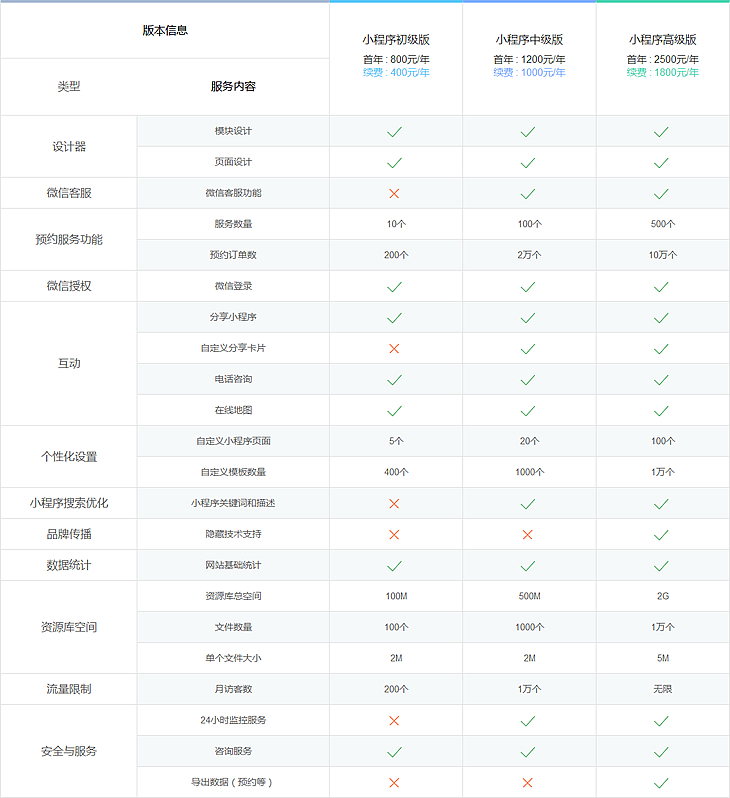 根據(jù)功能不同,我公司小程序有三個版本,價格分別為:800元(續(xù)費(fèi)400元),1200元(續(xù)費(fèi)1000元),2500元(續(xù)費(fèi)1800元),以上價格為已有認(rèn)證微信公眾號的報價,如需代理開通微信公眾號首年另加500元 詳細(xì)功能介紹 >>
